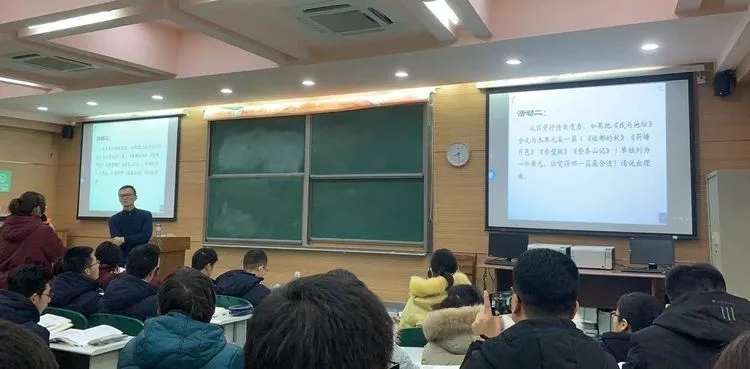 现任长沙市骨干教师、湖南省语文名师工作室首席名师、湖南师范大学文学院硕士研究生导师秦洁老师在分析语文新教材教学策略。